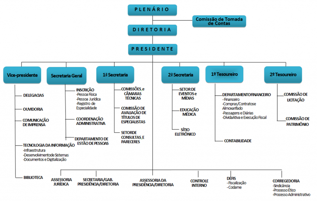 A estrutura organizacional do CRM-MS contempla o processo de divisão do trabalho e a alocação de responsabilidades e está definida conforme abaixo: