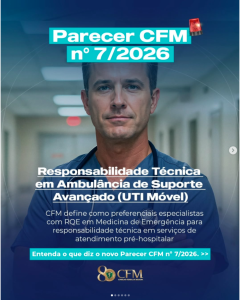 O Conselho Federal de Medicina (CFM) aprovou o Parecer nº 07/2026, que trata da responsabilidade técnica em serviços móveis de emergência (como ambulâncias de suporte avançado – UTIs móveis) e estabelece critérios para a atuação de médicos nesses contextos. O documento responde a consulta encaminhada pelo Conselho Regional de Medicina do Espírito Santo (CRM-ES) sobre a exigência de Registro de Qualificação de Especialista (RQE) para médicos responsáveis técnicos desses serviços.